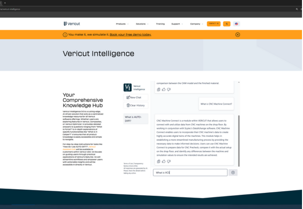 Vericut will also showcase its new AI-driven capabilities, including Vericut Intelligence and Vericut Assistant. Vericut Intelligence (VI) is a cutting-edge, AI-driven solution that acts as a centralised knowledge resource for all Vericut software offerings. Complementing VI, Vericut Assistant (VA) focuses on guiding users through practical applications of Vericut’s features.